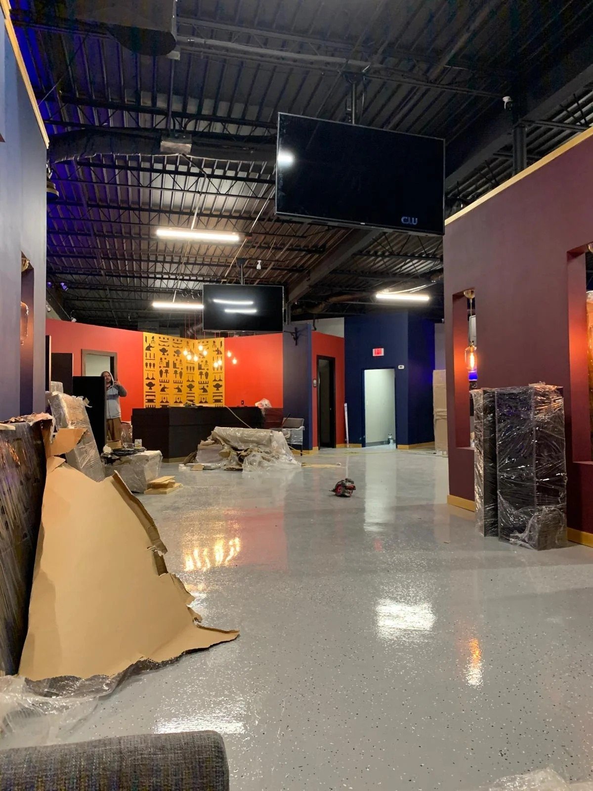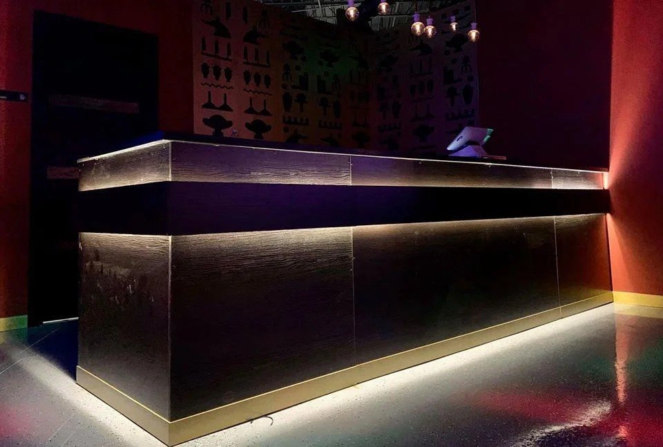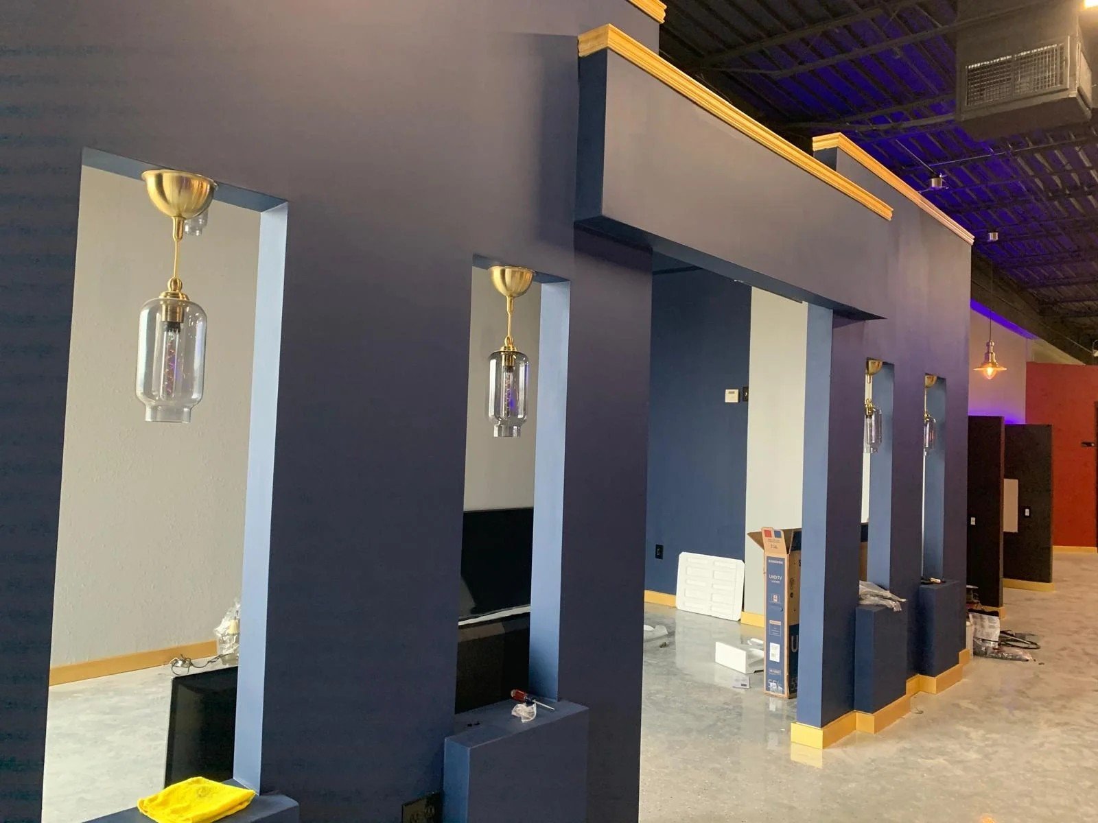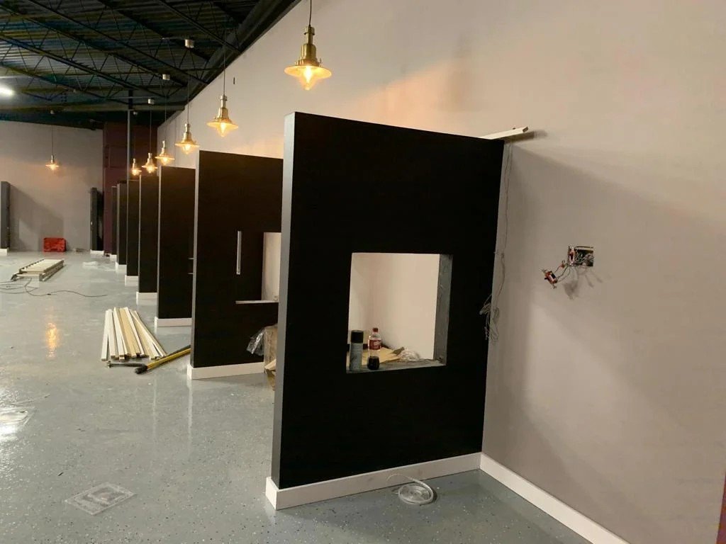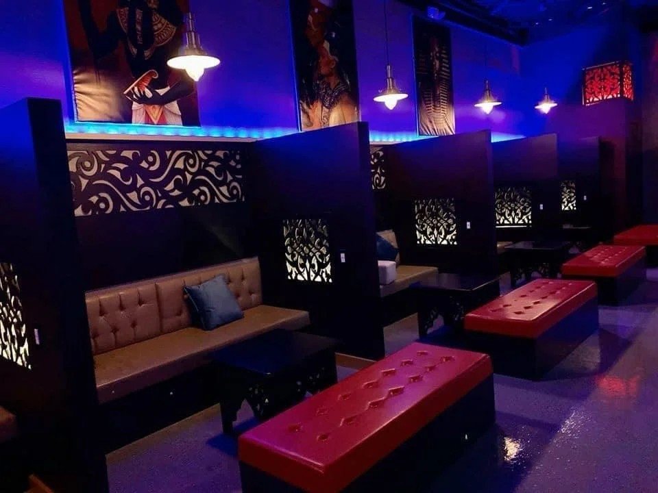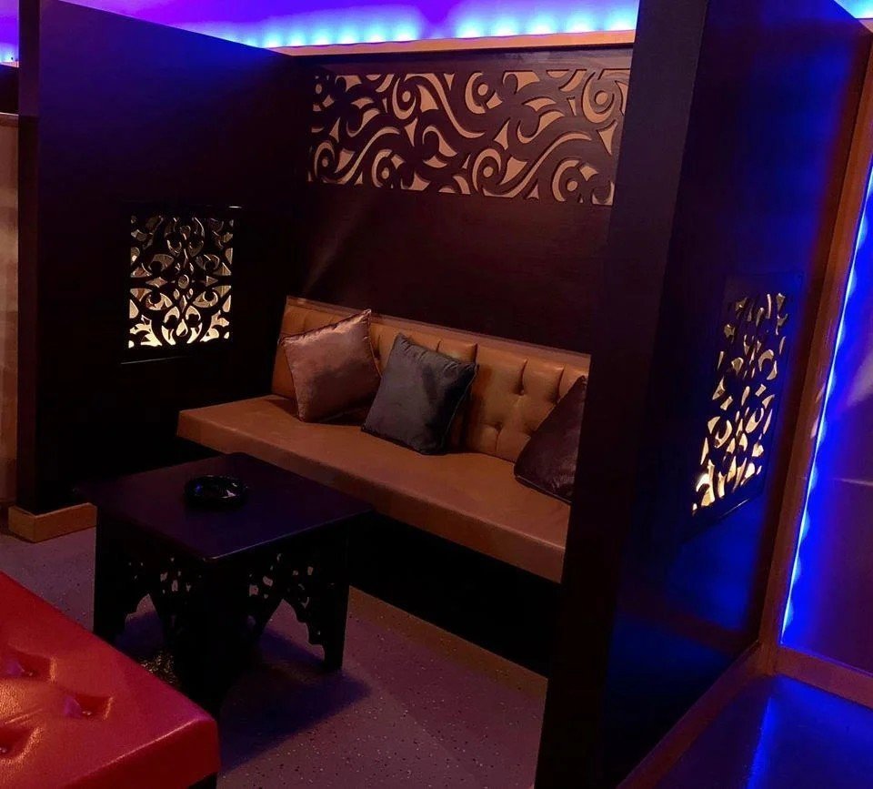 This lounge showcases a refined blend of contemporary design and cultural elegance. Featuring cozy booth seating, custom-cut wood paneling, vibrant accent lighting, and a polished finish, the space is being transformed into a high-end social venue ideal for relaxing and entertaining.