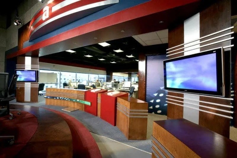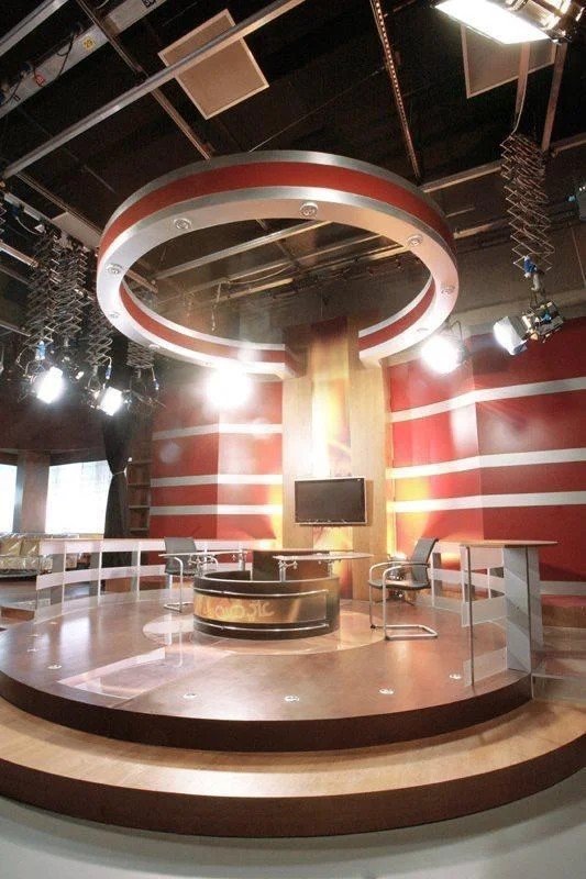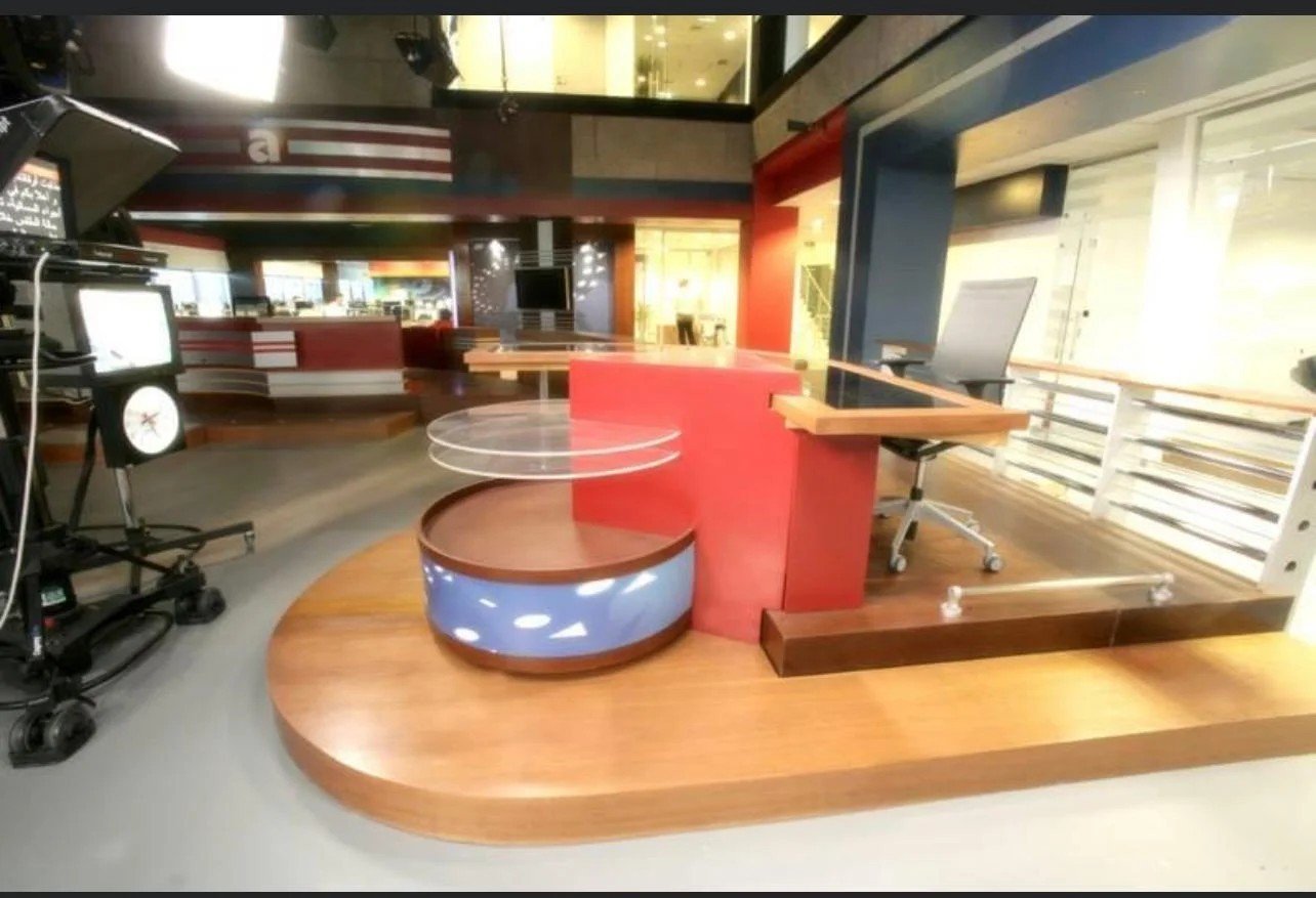 This series of images showcases the construction and setup of a modern news studio, featuring a dynamic blend of red, blue, and wooden finishes. The studio combines functionality with aesthetic appeal, ensuring a professional environment ideal for live broadcasts.