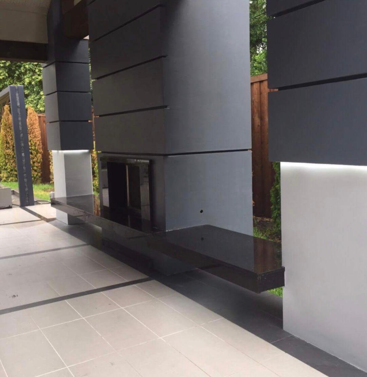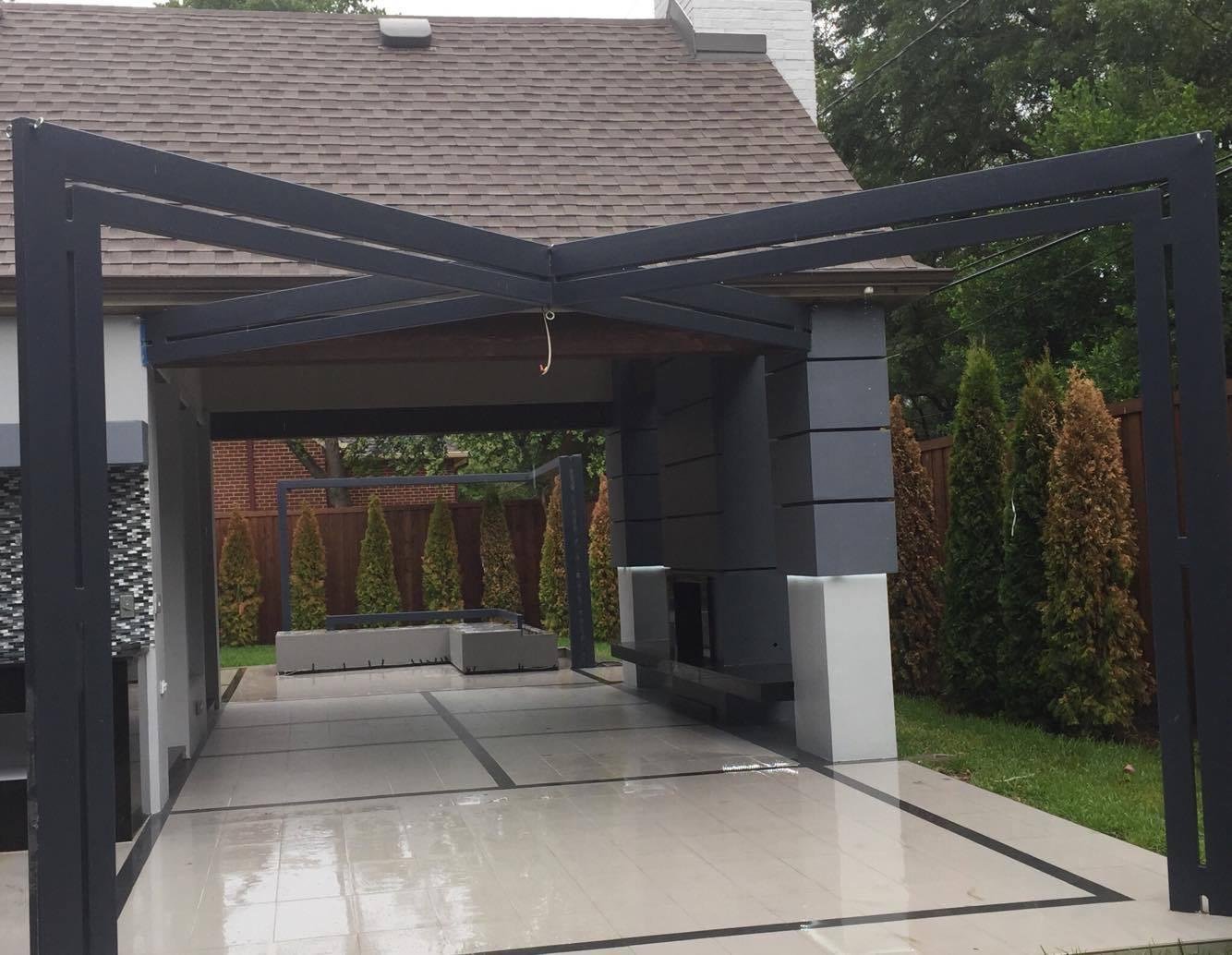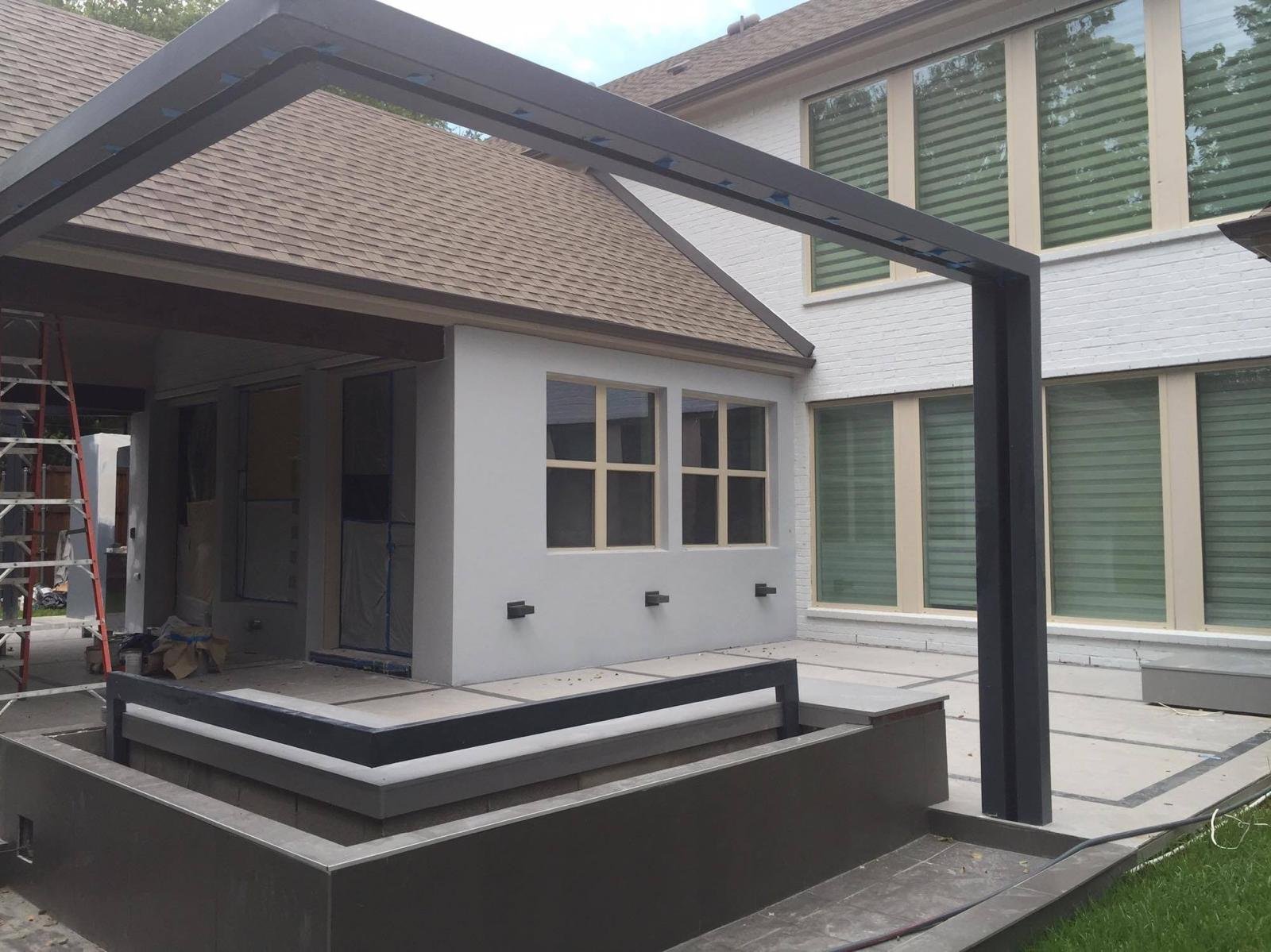 This custom-designed outdoor living space blends sleek modern architecture with functional luxury. Featuring a gourmet kitchen, a striking rain curtain, and sophisticated finishes, this project transforms the backyard into a resort-style retreat perfect for entertainment and relaxation.